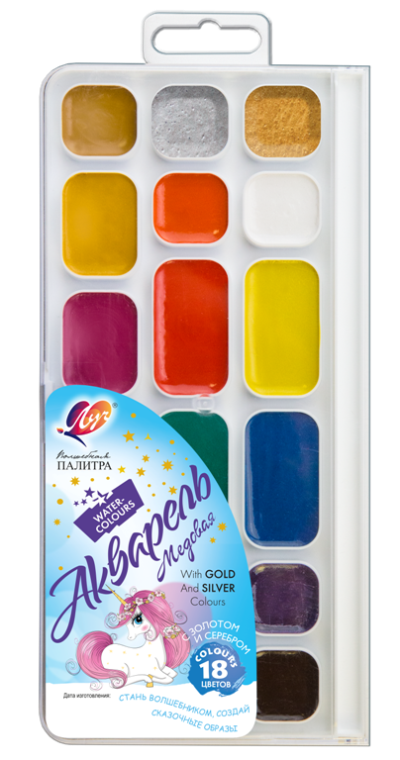 Пластмассовое донышко набора акварели содержит увеличенные кюветы с часто используемыми цветами