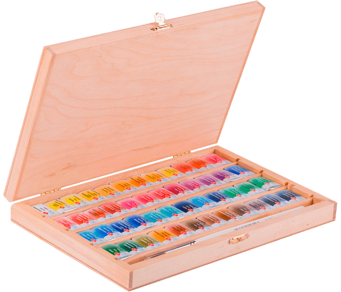 Высокая концентрация пигмента обеспечивают максимальную интенсивность цветового тона акварели. Насыщенность сохраняется даже при разбавлении большим количеством воды. Отличаются прозрачностью, что дает возможность художнику работать тонкими лессировками. Чистые цвета позволяют писать в смесях и получать богатое многообразие оттенков. Основная часть красок обладает высочайшим показателем светостойкости, что способствует сохранности работ свыше 100 лет. Традиционный состав набора «Белые ночи» из 36 цветов наиболее полно раскрывает потенциал живописных приемов и техник акварели. В комплектацию набора также входит кисть из натурального волоса белки.