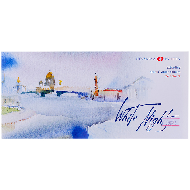 Высокая концентрация пигмента обеспечивают максимальную интенсивность цветового тона акварели. Насыщенность сохраняется даже при разбавлении большим количеством воды. Отличаются прозрачностью, что дает возможность художнику работать тонкими лессировками. Чистые цвета позволяют писать в смесях и получать богатое многообразие оттенков. Основная часть красок обладает высочайшим показателем светостойкости, что способствует сохранности работ свыше 100 лет. Все это обеспечивает их высокое качество и возможность использования в ответственных работах. Сбалансированная палитра набора «Белые ночи» состоит из 24 цветов, позволяющих решить множество творческих задач акварелиста. Набор представлен в пластиковом коррексе и картонном чехле.