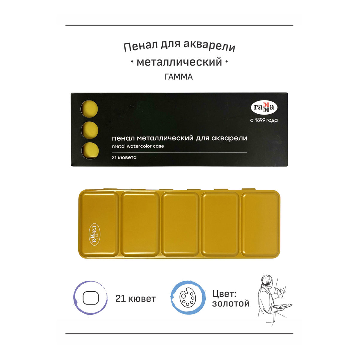 Пеналы подходят для создания индивидуальной палитры цветов и хранения кювет с любимыми цветами. На обороте пенала расположено специальное кольцо под палец для надежной фиксации в руке художника во время работы. Пенал оснащен раскладной палитрой для смешивания красок. Внутри пенал белого цвета ? для чистого смешения оттенков. В комплекте салфетка из микрофибры для очистки палитры или промокания кисти. Также салфеткой можно убрать излишки воды с бумаги.