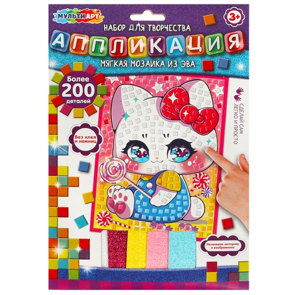 С помощью красочной основы и разноцветных деталей из мягкого материала маленький любознайка сможет самостоятельно создать яркую аппликацию с изображением милой кошечки. Готовая поделка станет отличным вариантом для подарка близким или для украшения детской комнаты.